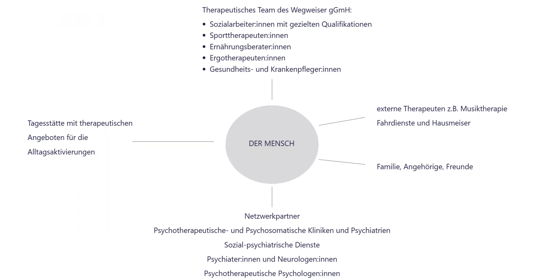 Das Therapeutenteam bzw. die qualifizierten Betreuungskräfte des Wegweiser gGmbh und externe Netzwerkpartner wie Psychiater, Neurologen, Psychotherapeuten aus der Region runden das Konzept ab. So wird sichergestellt, dass eine hohe Qualität an Therapien und ärztlich-psychotherapeutische Behandlung Hand in Hand gehen.